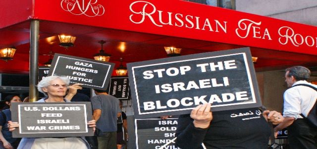 ه A group of 50 protesters picketed on West 57th Street outside New York's venerable Russian Tea Room on Thursday evening in opposition to an appearance there by Tzipi Livni. Ms. Livni is a former Foreign Minister of Israel as well as the leader of the opposition party, Kadima. Her speech was the closing session of a two-day conference on "Peace and Security" hosted by the International Centre for the Study of Radicalisation and Political Violence, a think tank affiliated with Kings College, London, as well as the University of Pennsylvania. The Livni speech was also hosted by the Hudson Union Society, an organization with ties to Yale University. Yesterday's protest was organized by members of Jews Say No!, American Jews for a Just Peace, and Adalah-NY: The New York Coalition for the Boycott of Israel. All three groups have been sponsors of other recent protests against Israeli military actions, including the deadly May 31 assault on an international flotilla carrying humanitarian supplies, and the attack on Gaza in December 2008-January 2009 which killed more than 1400 Palestinians. Yesterday's Russian Tea Room picketers carried signs that accused Israel of war crimes and referenced the numbers of civilians killed in recent Israeli military campaigns. The protesters distributed handbills that described Livni as a key official responsible for Israel's attacks on Lebanon in 2006 and on Gaza last year. The handbills asked, "Why is an audience at the Russian Tea Room listening to Israeli war criminal Tzipi Livni talk about 'peace?'" and quoted a 2009 Der Spiegel interview with Livni in which she avowed, ""Naturally I regret every civilian casualty, but what happened at the UN school was not a mistake," a reference to the January 2009 bombing of the United Nations school in Gaza City by the Israeli Defense Forces. The protesters called for an end to Israel's three-year-old blockade and siege of Gaza, and for support of the Palestinian call for international Boycott, Divestment and Sanctions against Israel. Perhaps because audience members' identification was being scrutinized by the conference's security personnel, or perhaps because of the limited capacity of the Russian Tea Room's elevators, some incoming audience members were forced to line up on the sidewalk in front of the restaurant. This left them standing directly beside the chanting picketers for several minutes at a time, though there was no direct interaction between the two groups. Queued patrons avoided eye contact and talked quietly among themselves, while protesters strolled past and sang promises to "keep on walkin', keep boycottin', til Palestine is free." |