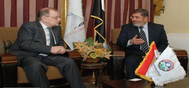 Freedom and Justice Party, (FJP), President Dr. Mohamed Morsi received Russia’s Ambassador to Cairo, Serge Kerbetchenko at the partys headquarters, Sunday December 25. During the meeting numerous topics were addressed including the democratic transition in Egypt and the party’s vision concerning Egypt’s current political landscape, the upcoming presidential elections, the constitution and Egypt’s bi-lateral relations with Russia.
