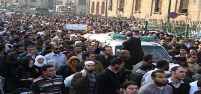 Thousands of Egyptians, men and women, young and old, Muslims and Christians marched out of Al-Azhar mosque during the funeral of martyr Sheikh, Emad Effat, the Secretary of Fatwa Department in Darf al-Ifta, who was killed by fire shot in Tahrir yesterday.