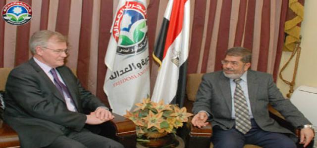 At the FJP's headquarters, Dr. Mohamed Morsi, Party Chairman, received on Monday afternoon James Moran, the European Union Ambassador to Egypt, who vowed support for Egypt's transition to Democracy.