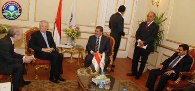 Dr. Mohamed Morsi, Chairman of the Freedom and Justice Party (FJP), received on Tuesday, 10 April 2012, Mario Monti, the Prime Minister of Italy, at the FJP’s headquarters in Cairo. Dr. Morsi discussed the political scene in Egypt during the transition period, the FJP’s views regarding the situation in Egypt under the next government, and ways to bolster political and economic relations between Egypt and Italy.